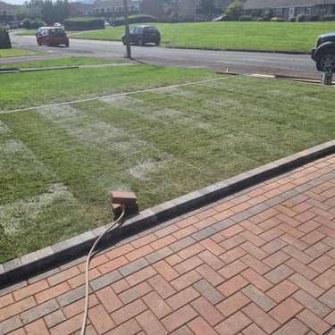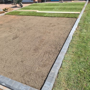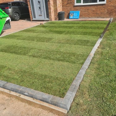 A complete transformation—replacing an old tarmac driveway with red brindle and charcoal block paving, re-turfing the lawn, and adding charcoal edging to complement the level change with a clean, cohesive finish.