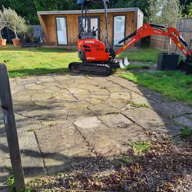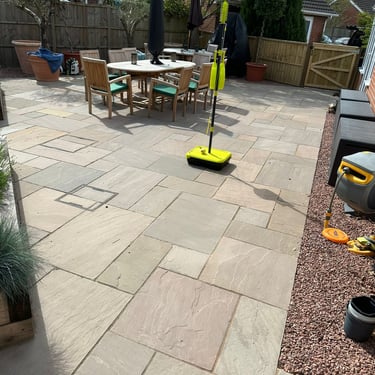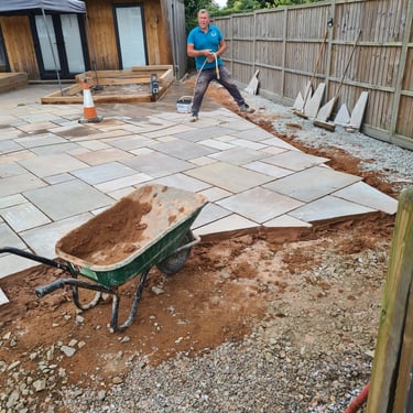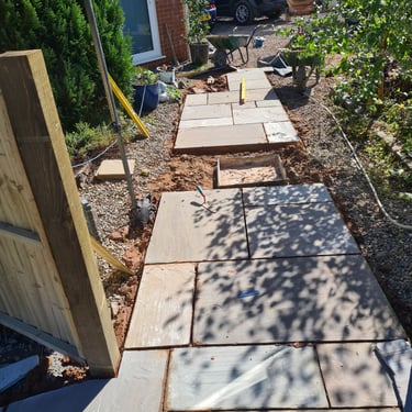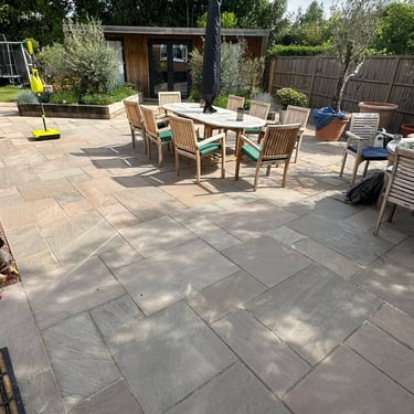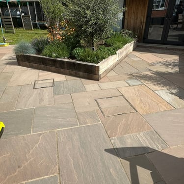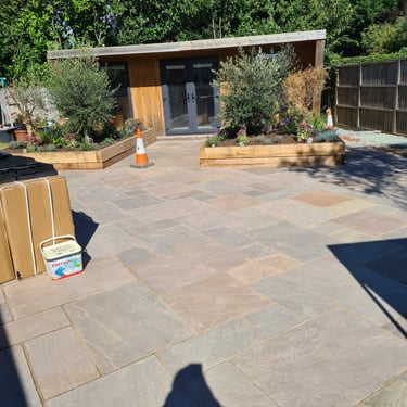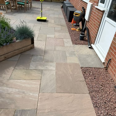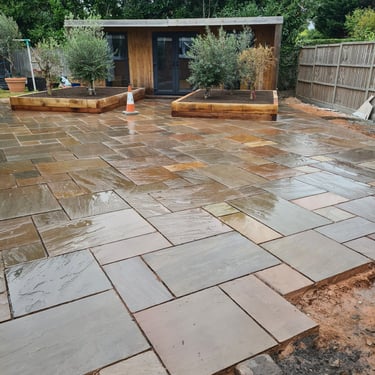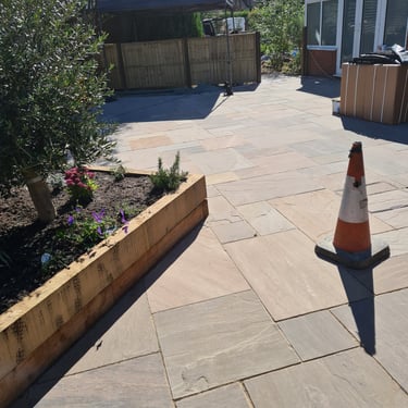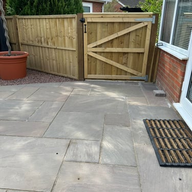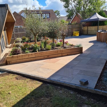 A complete transformation—replacing an old patio and lawn area with elegant natural stone paving, raised sleeper flower beds, and decorative gravel edging for a stunning finish and replacement of a small fence and gate.
